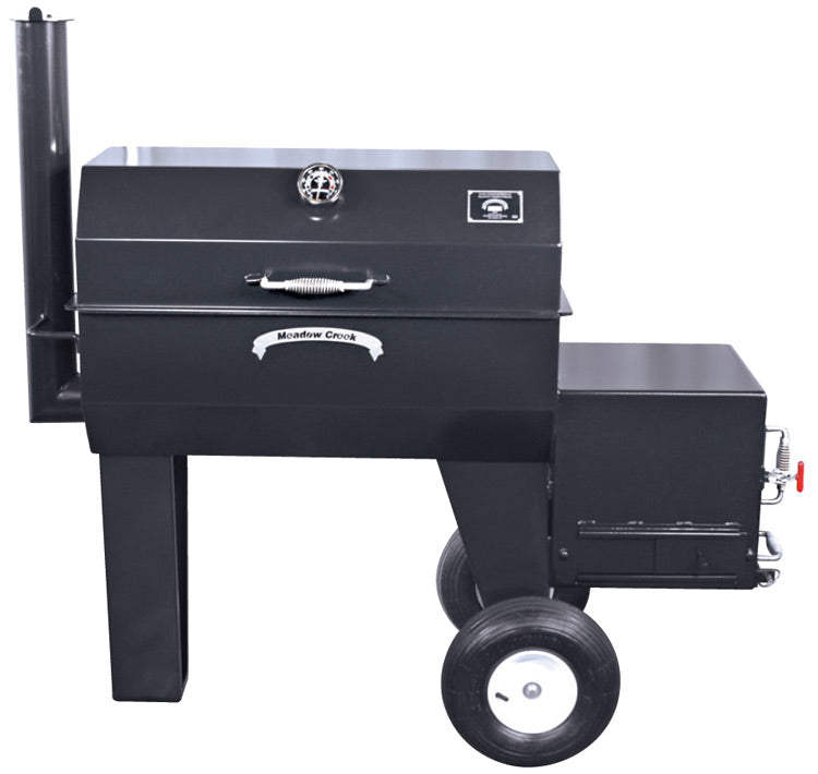 This Meadow Creek SQ36 charcoal smoker uses the same indirect flow as their other smokers. The body is constructed from 13 gauge welded steel that is coated with a heat resistant matte black paint. The two over sized wheels make moving this offset smoker simple. It's 14.5" x 35" grate provide 507 square inches of smoking space. The SQ36 is designed to fill the cavity of the roaster evenly with smoke and keep the temperature relatively the same at either end of the smoker.