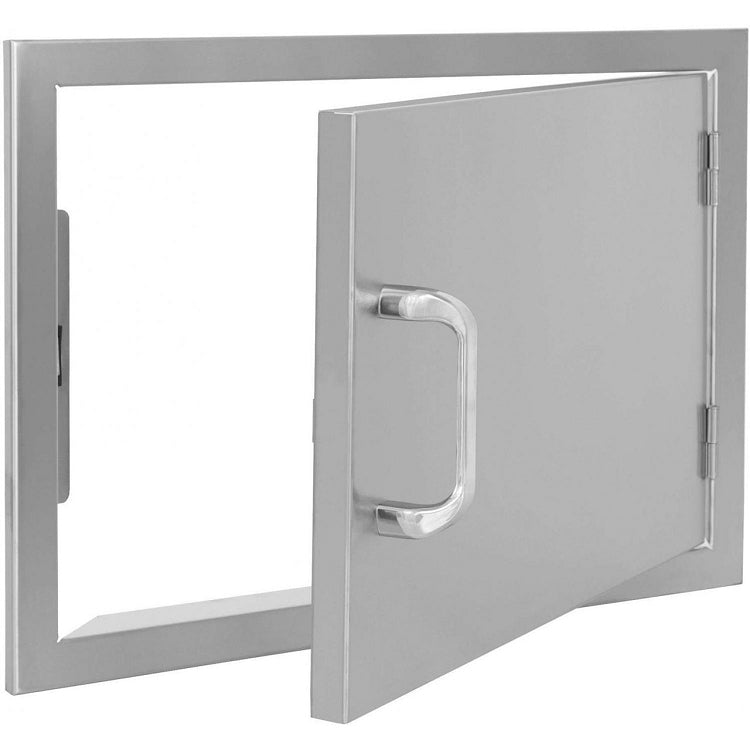 The BBQ Island 260 Series 17 x 24 Inch Horizontal Single Access Door offers you storage space for your new or existing outdoor kitchen,with ample space you will have the perfect storage area to organize your supplies. This door is crafted from high quality 304 Stainless Steel with a solid frame and hinges. The welds are ground and blended with a brushed finish creating a complete look. This unit will be shipped with a white vinyl covering to protect surfaces during fabrication, handling and installation. Once it is in place, peel off the protective vinyl to expose the luster and quality of your superior American made outdoor kitchen unit. The 260 Series features chrome plated handles that will give your outdoor kitchen a sleek look, upgrade to a more modern look with the 300H handles. The doors/drawers come flush on a box frame.