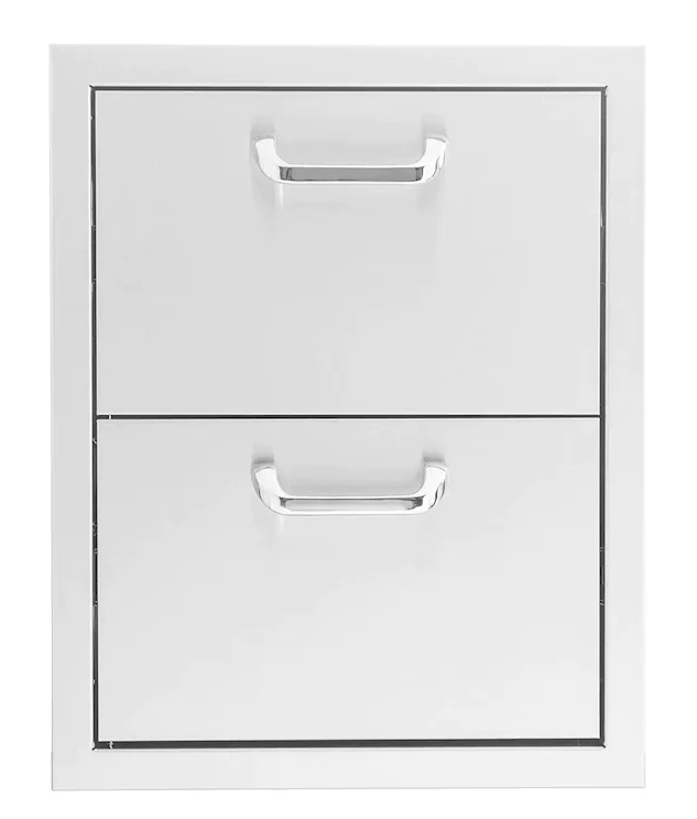 The BBQ Island 260 Series Double Drawer Storage combines the ultimate in premium fit and finish with convenience and style. This drawer will be a great addition to any outdoor kitchen. Fully enclosed with solid frames and full length, heavy duty drawer glides - it operates smoothly. This drawer is crafted from high quality 304 stainless steel with a solid frame and strong drawer glides. The drawer tracks are full length, galvanized steel with smooth action ball bearings that allow the drawer to open and close easily. The welds are ground and blended with a brushed finish creating a complete look. This unit will be shipped with a white vinyl covering to protect surfaces during fabrication, handling and installation. Once it is in place, peel off the protective vinyl to expose the luster and quality of your superior American made outdoor kitchen unit. The 260 Series feature chrome plated handles that will give your outdoor kitchen a sleek look, update to the 300H handles for a more modern look. The doors/drawers come flush on a box frame.