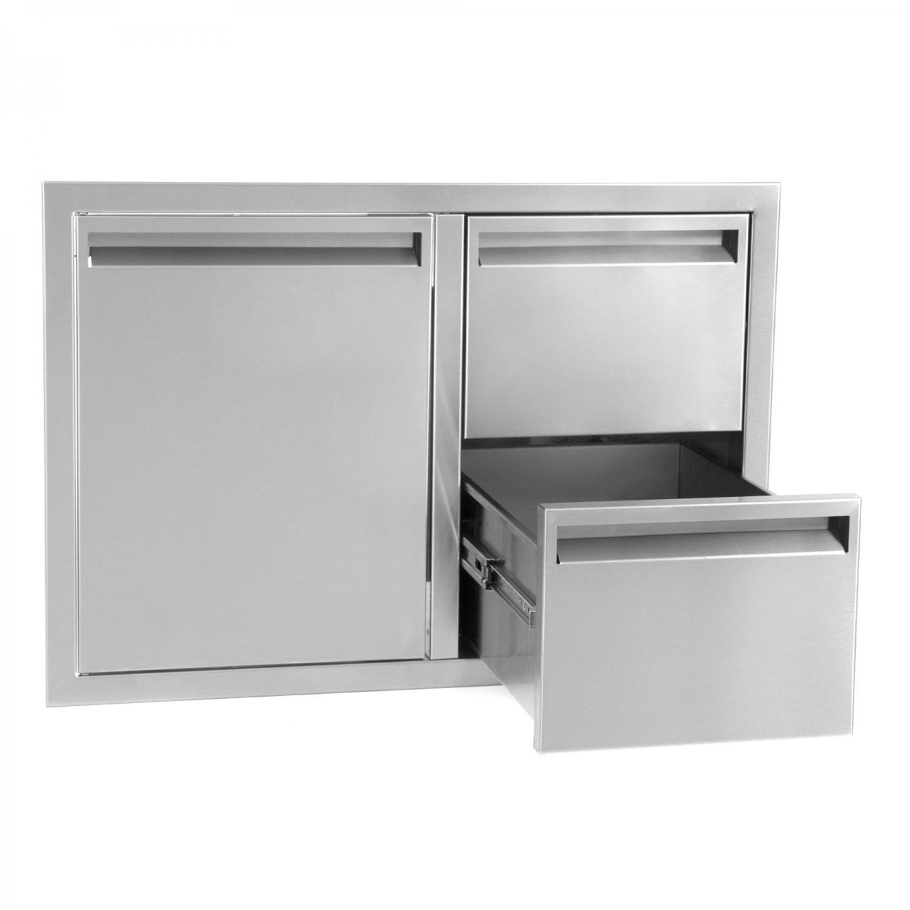 The BBQ Island 350 Series 32 Inch Single Door with 2 Drawers Combo offers you storage space for your new or existing outdoor kitchen, with ample space you will have the perfect storage area to organize your supplies. This door is crafted from high quality 304 Stainless Steel with a solid frame and hinges. The welds are ground and blended with a brushed finish creating a complete look. This unit will be shipped with a white vinyl covering to protect surfaces during fabrication, handling and installation. American made unit with true stainless steal!