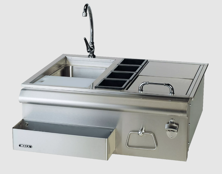 The Bull 30 inch stainless steel slide-in bar center with ice chest & sink is the ultimate bar insert for you outdoor entertainment center. This unit contains four rubber condiment holders, a sink and faucet and built in chopping block. We added a bottle opener, towel rack, ice chest and bottle caddy to hold your favorite spirits. This bar center integrates with your Bull outdoor BBQ island to add the finishing touch to your outdoor kitchen grilling area.