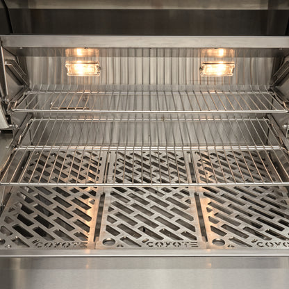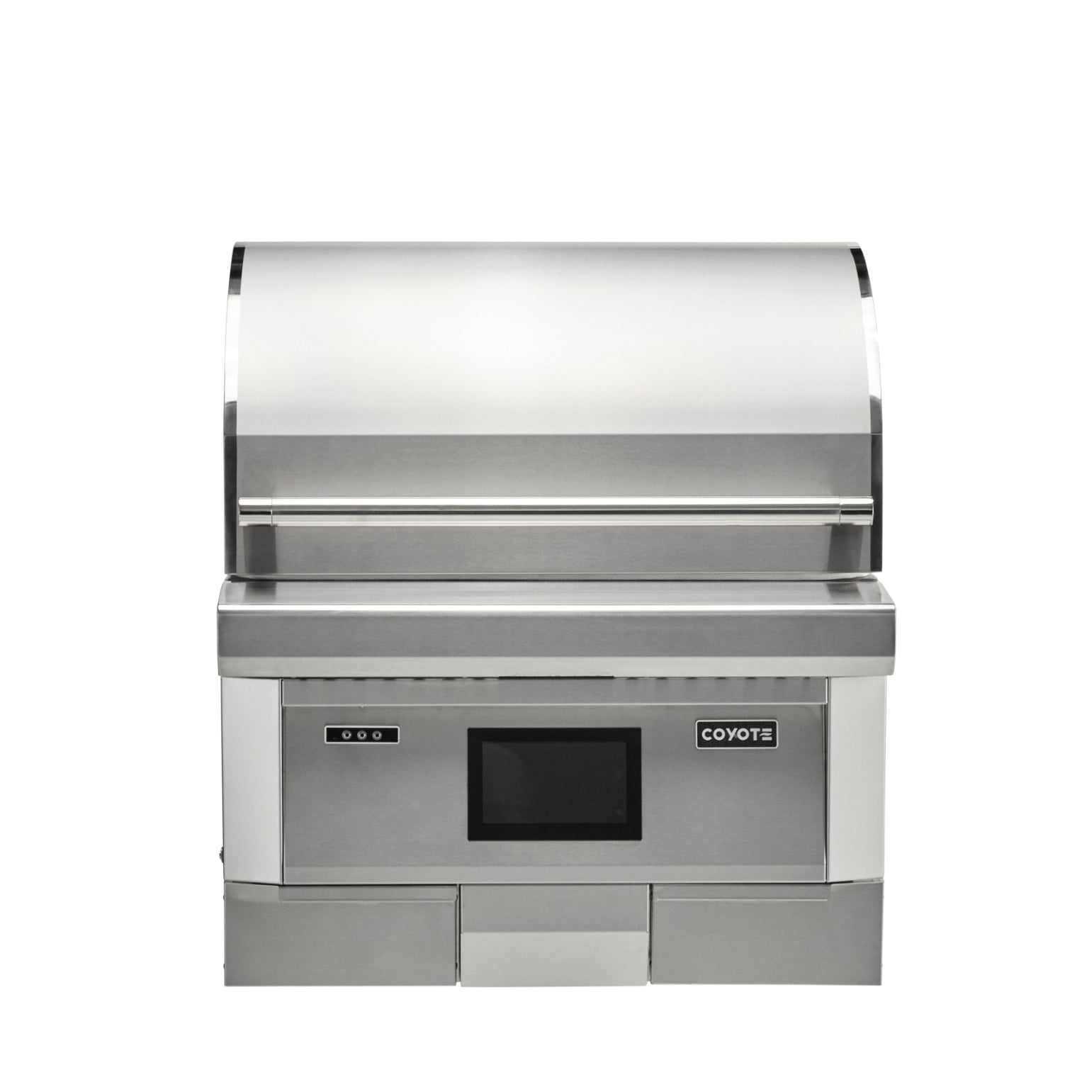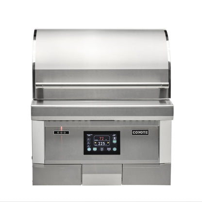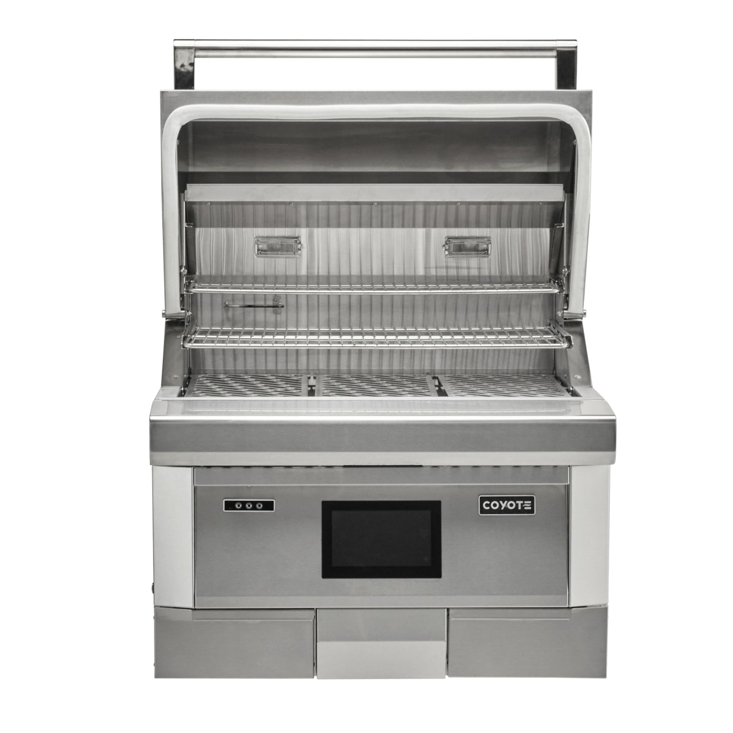 The Coyote 28-Inch Next-Gen Built-In Pellet Grill is designed to deliver an exceptional pellet grilling experience with a host of innovative features. User-friendly elements like the front-loading pellet hopper and spring-assisted hood make operation smooth and convenient. Engineered to perform in any weather, it includes a double-walled canopy hood with a gasket seal, integrated wind guard, and rain guard for consistent performance rain or shine.