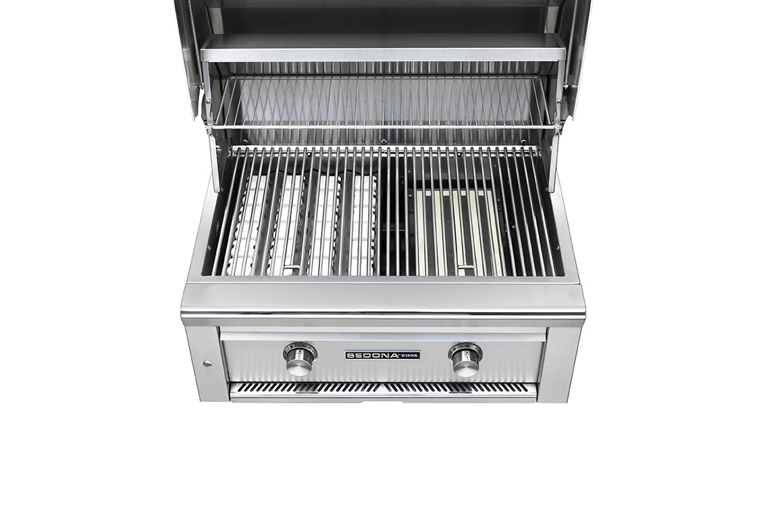 The Lynx Sedona 30" Natural Gas Grill- LP500PS-NG: The Lynx Sedona 30" Natural Gas Grill incorporates many of the same features found on their more expensive grills. This grill is heli-arc welded and does not use any mechanical fasteners. The precision welding forms pieces into a solitary integrated body of gorgeous stainless steel, free of gaps and seams where moisture and grease can collect. Not only does this add structural integrity to the grill it also makes cleaning a lot easier, and despite the hood weighing over 30 lbs the spring assist enables you to open and close the grill with one finger. An internal super bright halogen light makes grilling at night a breeze and the blue LED illuminated control knobs let you see where they are set even in total darkness. The included ProSear zone burner is fully adjustable so you can sear a steak at 1500 degrees or grill as low as 200! Many other manufacturers sear burners are either off or on and the problem with those is that you end up having a large portion of your grill that you can only sear on, but with Lynx's variable ProSear zone you retain the use of your entire grilling surface.