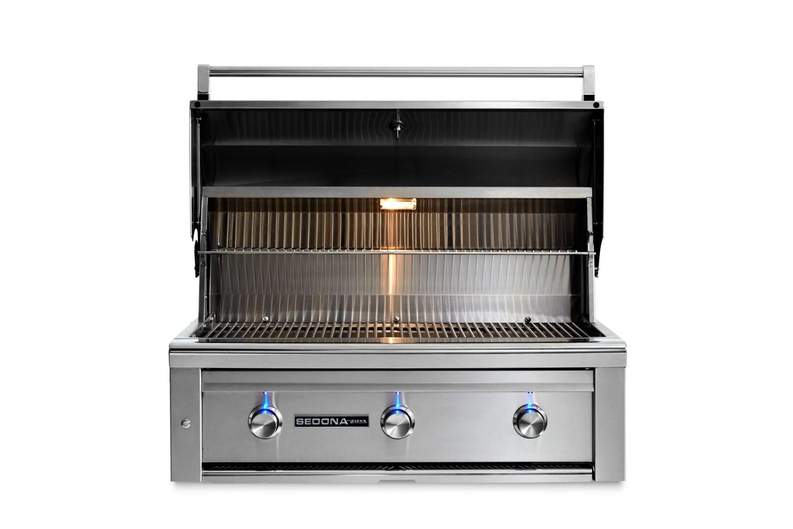 The Lynx Sedona 36 inch propane gas grill incorporates many of the same features found on their more expensive grills.  This grill is heli-arc welded and does not use any mechanical fasteners. The precision welding forms pieces into a solitary, integrated body of gorgeous steel, free of gaps and seams where moisture and grease can collect. Not only does this add structural integrity to the grill it also makes cleaning a lot easier. Despite the hood weighing over 30 lbs, the spring assisted hood lift enables you to open and close the grill with one finger.  An internal super bright halogen light makes grilling at night as simple as grilling during the day and the blue LED illuminated control knobs let you see where they are set even in total darkness. The optional sear zone is fully adjustable so you can sear a steak on it or grill low temperature foods. Many other grill's sear zones are either off or on. The problem with those is that you end up having a large portion of your grill that you can only sear on. With Lynx's variable sear zone you retain the ability to grill a larger range of foods.