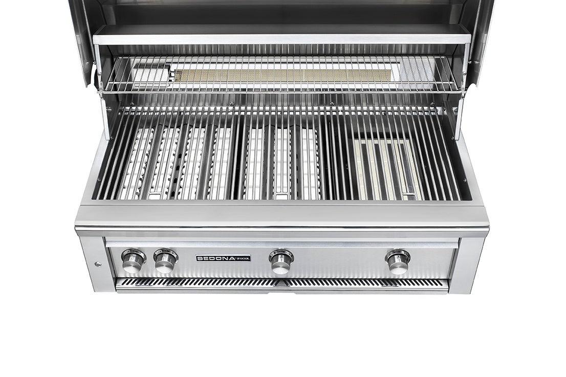 This 42 Inch Lynx Sedona grill has one ProSear burner and two stainless steel tube burners with a total of 69,000 BTUs. The ProSear burner uses infrared technology to sear meat to perfection or turn the burner on low for delicate seafood. This grill also has an internal rotisserie with heavy-duty motor and 14,000 BTU rear infrared burner to expand your versatility. Easily light the grill using the time tested spark ignition system with a battery backup for a reliable start every time. The ceramic briquettes click into place over the burners and distribute heat evenly across the grilling surface. The grill features stainless steel cooking grates with 728 square-inches of main cooking area and 321 square-inches of warming area, for a total of 1049 square-inches. The Lynx L700PSR natural gas built-in grill is made of thick gauge 201 stainless steel using continuous welded construction to eliminate gaps where grease and moisture can collect. The fluid rotation handle and hood assist kit help you lift the hood of the grill easily with just a finger. Blue LED control panel lights and internal halogen lights make grilling at night a snap. Bring the power and performance of Lynx innovation to your outdoor grilling with the Sedona by Lynx grill.