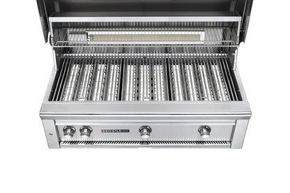The 42 Inch Lynx Sedona Grill with Rotisserie has two stainless steel tube burners with a total of 69,000 BTUs. The ProSear burner uses infrared technology to sear meat to perfection or turn the burner on low for delicate seafood. Easily light the grill using the time tested spark ignition system with a battery backup for a reliable start every time. The ceramic briquettes click into place over the burners and distribute heat evenly across the grilling surface. The grill features stainless steel cooking grates with 728 square-inches of main cooking area and 321 square-inches of warming area, for a total of 1049 square-inches. The Lynx L700R natural gas built-in grill is made of thick gauge 201 stainless steel using continuous welded construction to eliminate gaps where grease and moisture can collect. The fluid rotation handle and hood assist kit help you lift the hood of the grill easily with just a finger. Blue LED control panel lights and internal halogen lights make grilling at night a snap. Bring the power and performance of Lynx innovation to your outdoor grilling with the Sedona by Lynx grill.