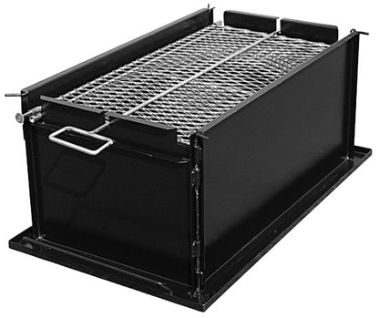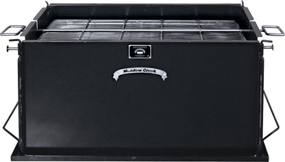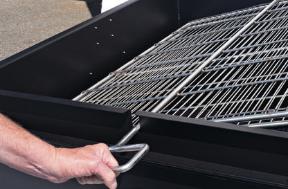 The Meadow Creek BBQ42C charcoal cooker's design, ensures fast cooking times and crispy chicken skin. The body is constructed from 13 gauge welded steel that is coated with a heat resistant matte black paint. It's 22" x 40" 304 stainless steel grate provides 880 square inches of cooking space and can hold up to 40 lbs of chicken. Welded grate handles make flipping your food a snap. The optional charcoal pullout makes it easy to add more fuel. The charcoal pan insert makes cleaning up fast and easy.