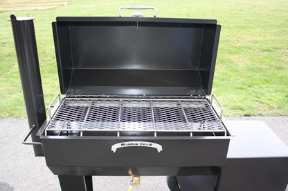 This Meadow Creek SQ36 charcoal smoker uses the same indirect flow as their other smokers. The body is constructed from 13 gauge welded steel that is coated with a heat resistant matte black paint. The two over sized wheels make moving this offset smoker simple. It's 14.5" x 35" grate provide 507 square inches of smoking space. The SQ36 is designed to fill the cavity of the roaster evenly with smoke and keep the temperature relatively the same at either end of the smoker.