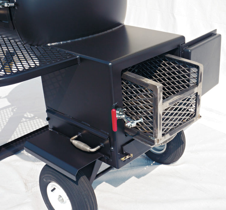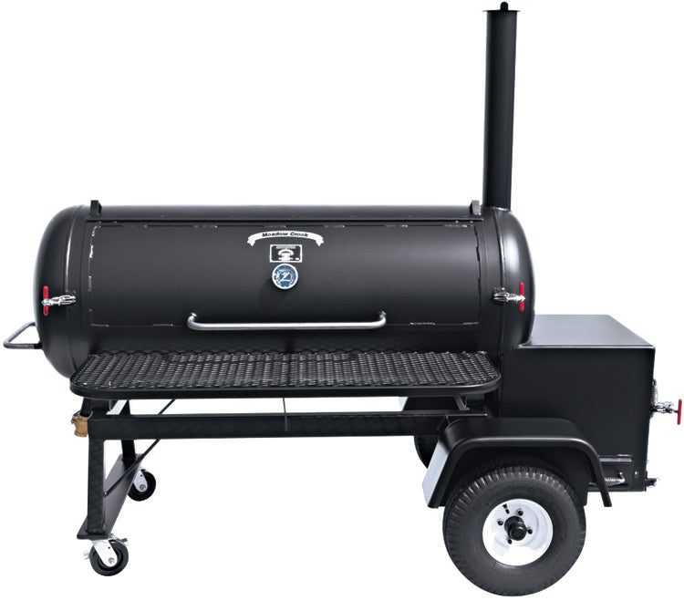 Meadow Creek smokers utilize the path of least resistance by employing the curved design of the tank end to provide a smooth, consistent draft and heat source.  Indirect heat from slowly burning wood or charcoal travels under the sealed drip pan. Smoke circulates around the meat for slow, even cooking.