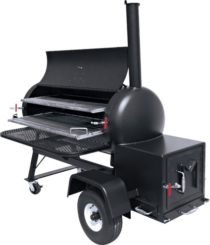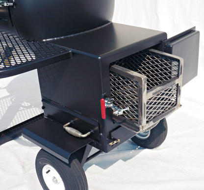 This Meadow Creek TS120P smoker uses the same indirect flow as their other smokers. The body is constructed from 13 gauge welded steel that is coated with a heat resistant matte black paint. The two over sized casters and large primary tires make moving this unit simple. It's 20" x 41.5" top grate and 22" x 41.75" lower grate provide 1,743 square inches of smoking space.