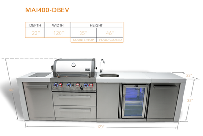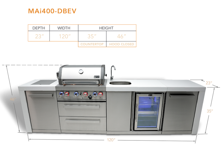 Introducing the Mont Alpi 4-burner Deluxe Island With A Beverage Center (MAi400-DBEV) – the ultimate grill for your backyard or patio! With its infrared side burner and rear burner, get ready to enjoy the perfect searing, pan-frying, boiling and rotisserie experience.