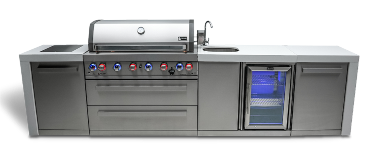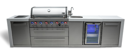 Introducing the Mont Alpi 6-burner Deluxe Island With A Beverage Center (MAi805-DBEV) – the ultimate grill for your backyard or patio! With its infrared side burner and rear burner, get ready to enjoy perfect searing, pan-frying, boiling and rotisserie experience. But that's not all – the well-appointed beverage center comes complete with an outdoor-rated fridge, sink and plenty of prep space. Plus, the LED knob lights and bright internal cooking lights make precision control a breeze.