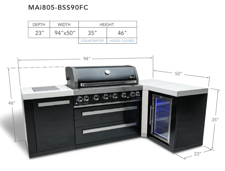 Upgrade your outdoor cooking game with the Mont Alpi Black Stainless Steel Island, featuring a 90-degree corner and a fridge cabinet. This grill combines style and durability, boasting six standard burners, an infrared side burner, and an infrared rear burner with a heavy-duty rotisserie kit for the ultimate cooking experience.