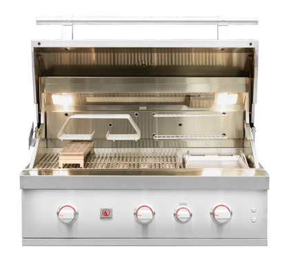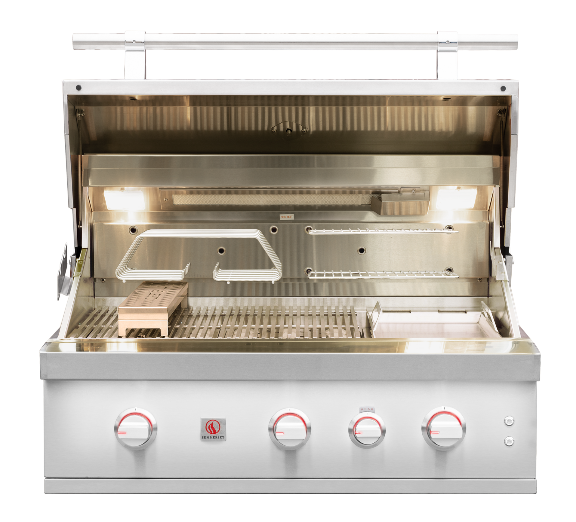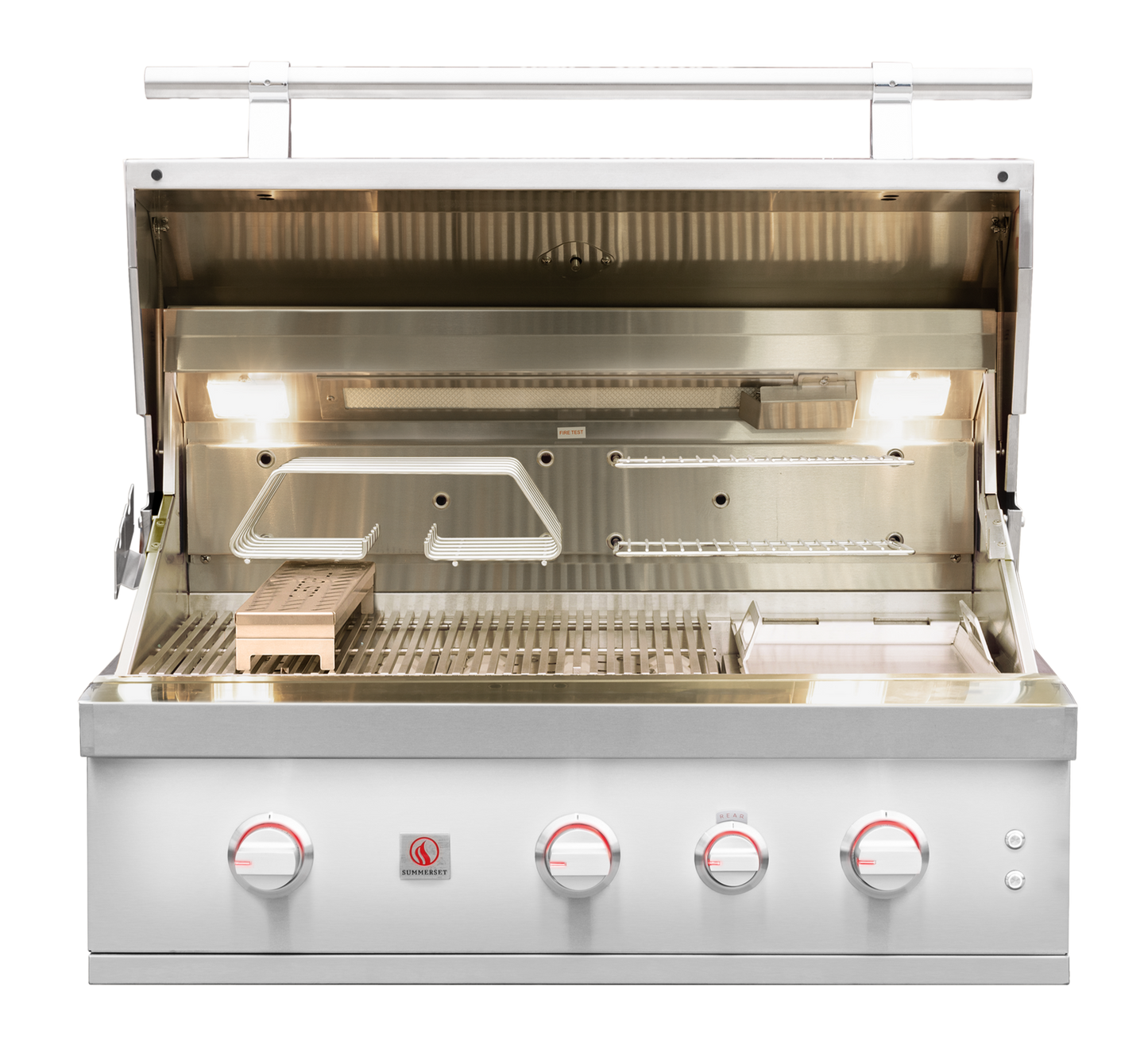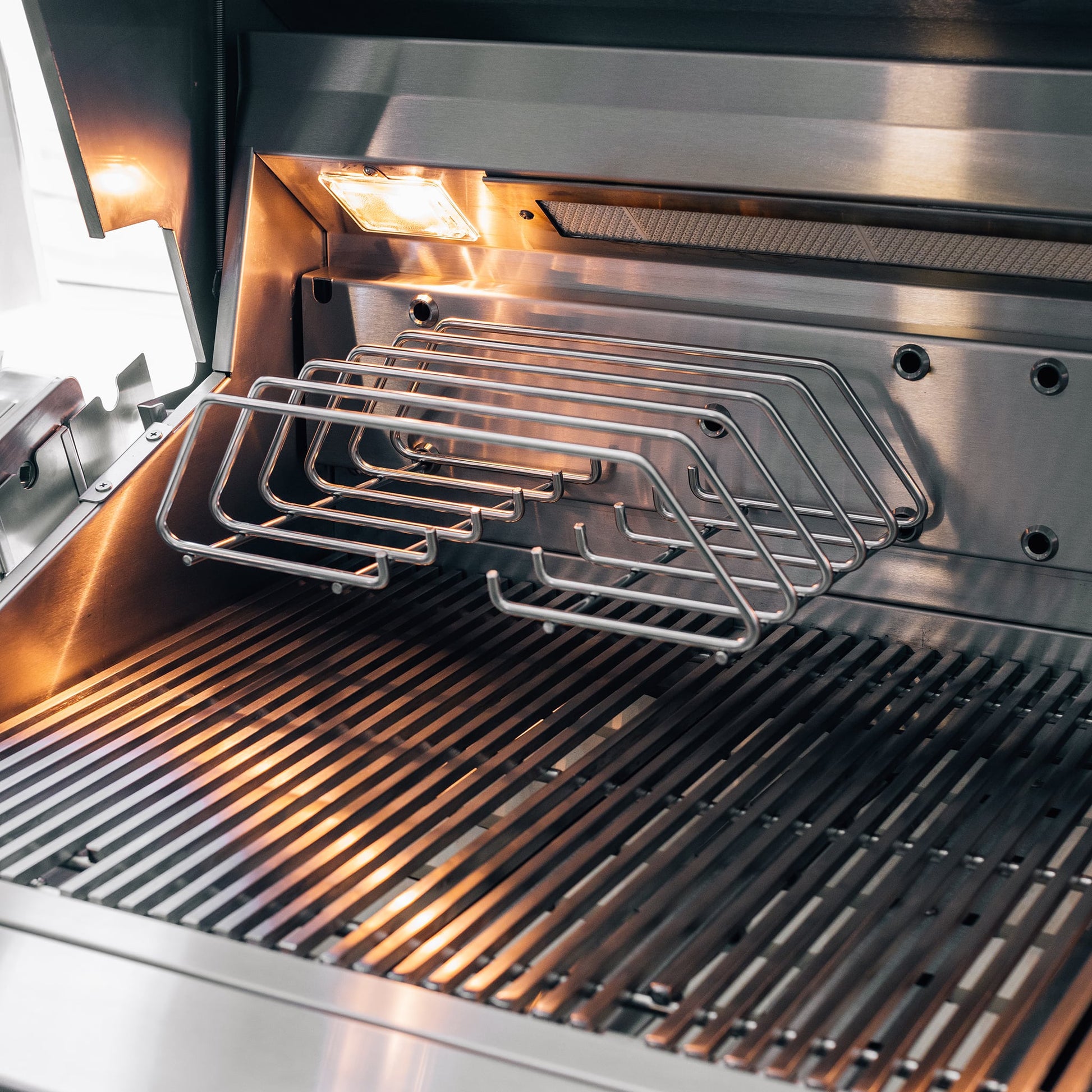 - Comes fully equipped with a Drop-In Griddle Plate, Smoker Box, Rib Rack, Rotisserie Kit, and Multi-Position Warming Rack