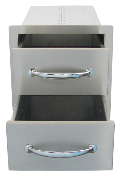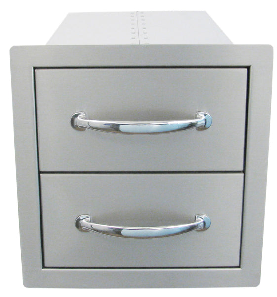 Sunstone 14 Inch Flush Double Access Drawer: Sunstone Grills island components provide the complete professional solution for outdoor kitchen builders at an affordable price. Be the envy of your neighborhood with Sunstone grills full line of outdoor kitchen and bbq island accessories. These Sunstone Grill fully enclosed double access drawers provide ample storage for all your bbq tools and accessories. These flush mount double drawers feature commercial grade 304 grade stainless steel construction with chrome plated handles and commercial grade drawer glides for easy opening.