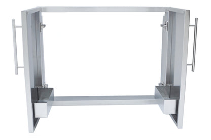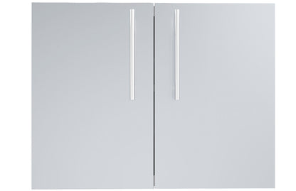 The Sunstone® Designer Series, Raised Style 30 inch Width by 23 Inch Height Double Door with inside Shelf per each door accommodates oversized grill tools and spices. The Double Doors are specially designed to be the same consistent 23 Inch height as all other Designer Series components – which provide a true designer friendly appeal. The component is raised off the finish wall 1-1/2 inches so to work with most any island structure including Veneer Stone, Stucco and as extra 4 inch deep inside flange to work with all Masonry Stone types. In Addition the frame is designed with an additional 1/16 inch frame around all four sides of component. Which makes the components multi-configurable Vertically & Horizontally, and are styled to match with Sunstone® Cabinet Island products, with both Cabinet Island and individual Designer Component combinations.