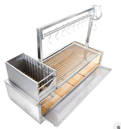 It features height adjustable grates and an interchangeable griddle (only available with round main grates) where you can cook your favorite vegetables and S shape meat hooks in which you can smoke or slow cook different foods like the Argentine famous "chorizo". The firebox gaucho style brasero allows you to light up the charcoal quicker and with less effort. It maintains your fire lit and away from food. You can use